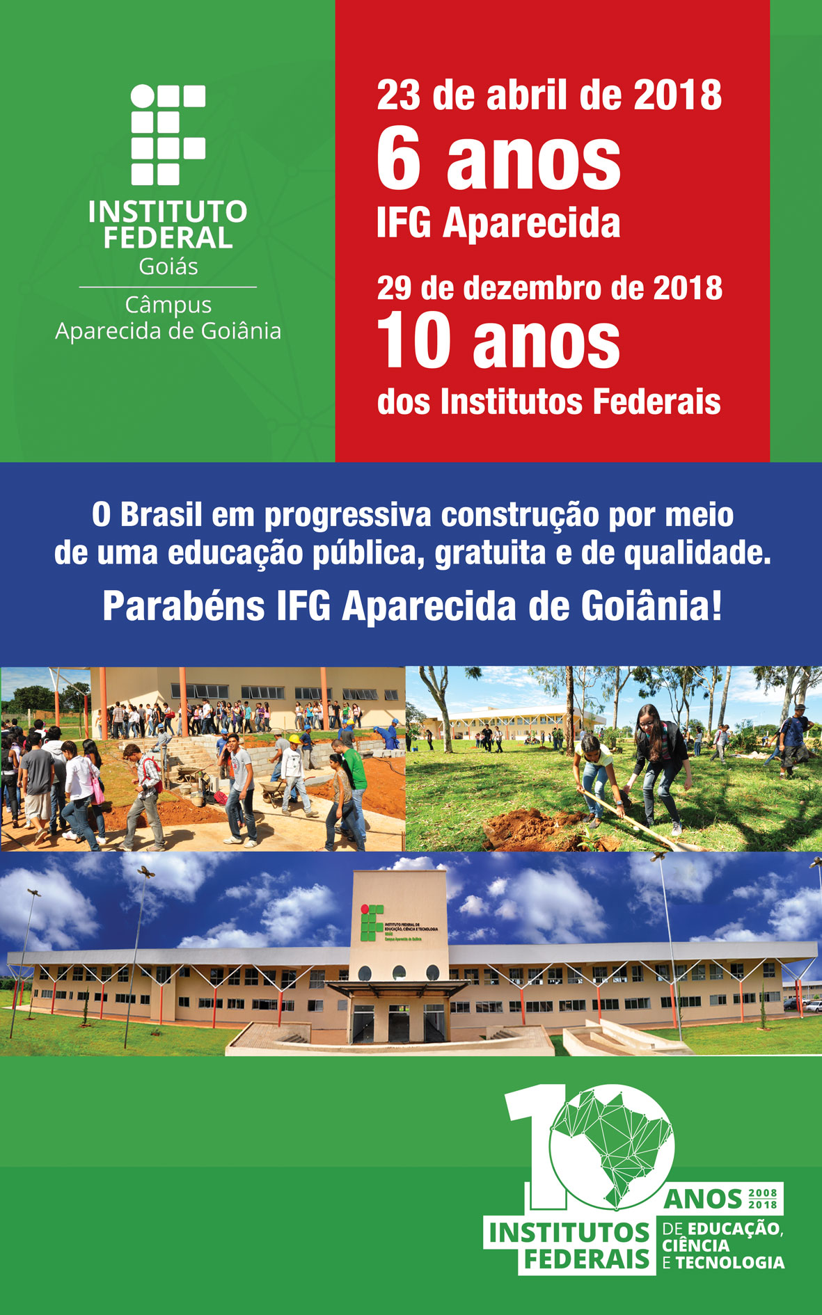Quero parabenizar, neste dia, os alunos, professores e técnicos administrativos do Câmpus Aparecida de Goiânia por nos permitir comemorar com orgulho os seis anos do IFG Aparecida e os 10 anos da Rede Federal de Educação Profissional, Científica e Tecnológica.