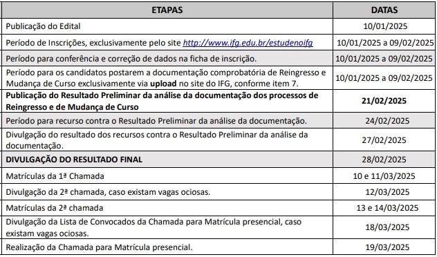 Podem se inscrever para reingresso nos cursos do Câmpus no primeiro semestre do ano letivo de 2025, os alunos dos cursos superiores que perderam o vínculo com o Câmpus Formosa e que atendam à condições estabelecidas no art. 7 da Resolução do Conselho Superior (CONSUP) do IFG nº 108/2021 e no art. 55 da Resolução CONSUP nº 147/2022.