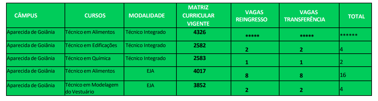 Estão abertas as inscrições do processo seletivo para Reingresso e Transferência nos cursos técnicos integrados ao ensino médio no IFG - Câmpus Aparecida de Goiânia. Há vagas para os cursos técnicos integrados em Edificações e Química (tempo integral) e para os cursos técnicos integrados em Alimentos e Modelagem do Vestuário (Educação de Jovens e Adultos - EJA). A inscrições são feitas somente pela internet, no endereço eletrônico http://ifg.edu.br/estude-noifg/selecoes-em-andamento/reingresso-e-mudanca-de-curso, até o dia 18 de março de 2025.