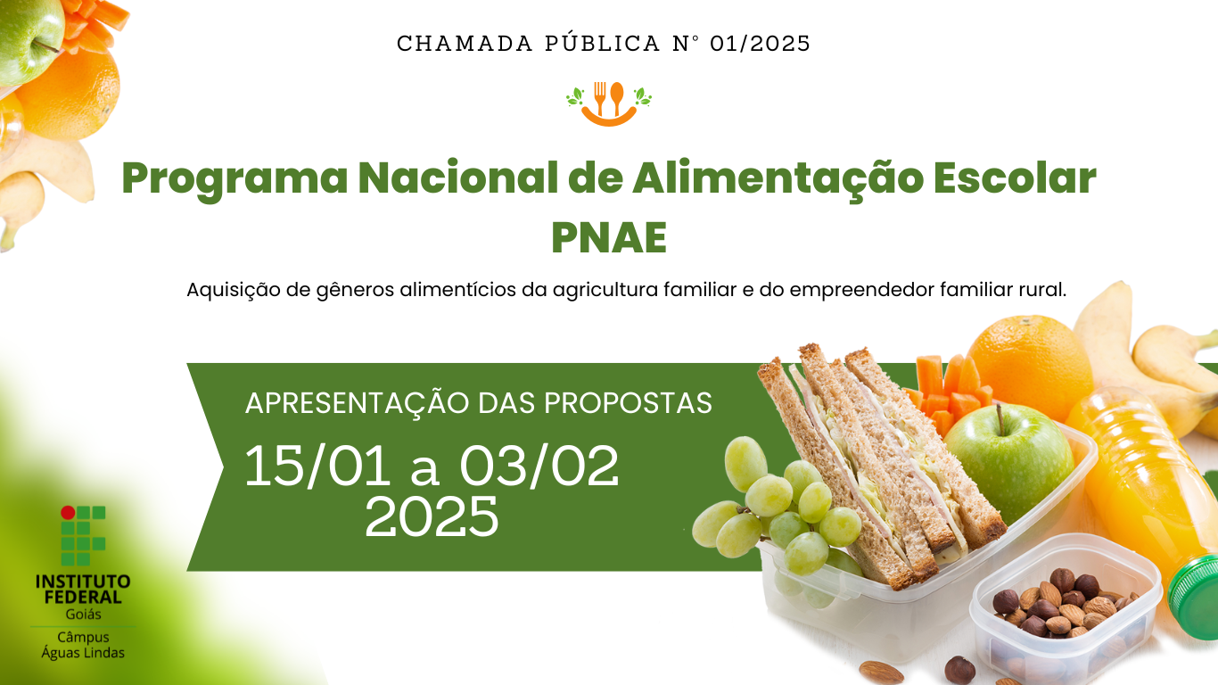 O Câmpus Águas Lindas do Instituto Federal de Educação, Ciência e Tecnologia de Goiás, está com chamada pública aberta para compra de alimentos da agricultura familiar pelo Programa Nacional de Alimentação Escolar (PNAE), durante o período de abril a maio de 2025. Podem participar apenas representantes da agricultura familiar e empreendedores familiares rurais do Estado de Goiás.