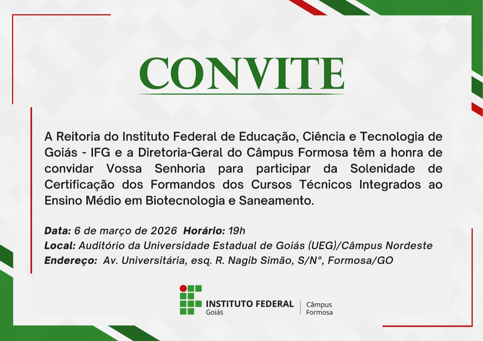 É com muita honra que o Instituto Federal de Goiás/Câmpus Formosa informa e convida a comunidade para prestigiar a Cerimônia de Certificação dos Formandos dos Cursos Técnicos Integrados ao Ensino Médio em tempo integral. A solenidade dos cursos de Biotecnologia e Saneamento acontecerá no dia 6 de março, sexta-feira, às 19h, no Auditório da Universidade Estadual de Goiás (UEG), em Formosa-GO.