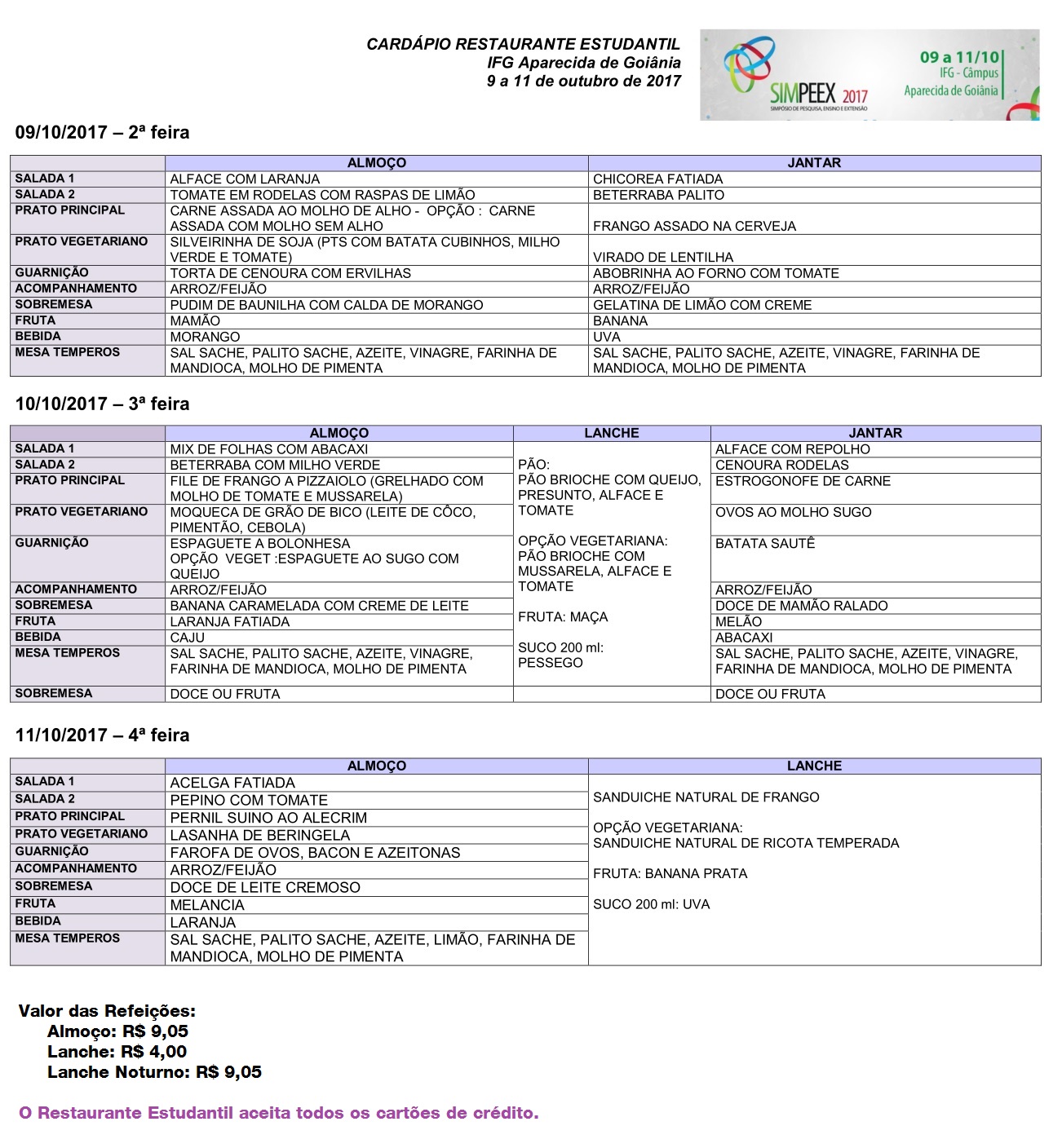 Veja o cardápio do Restaurante Estudantil do IFG Aparecida de Goiânia nos dias do SIMPEEX