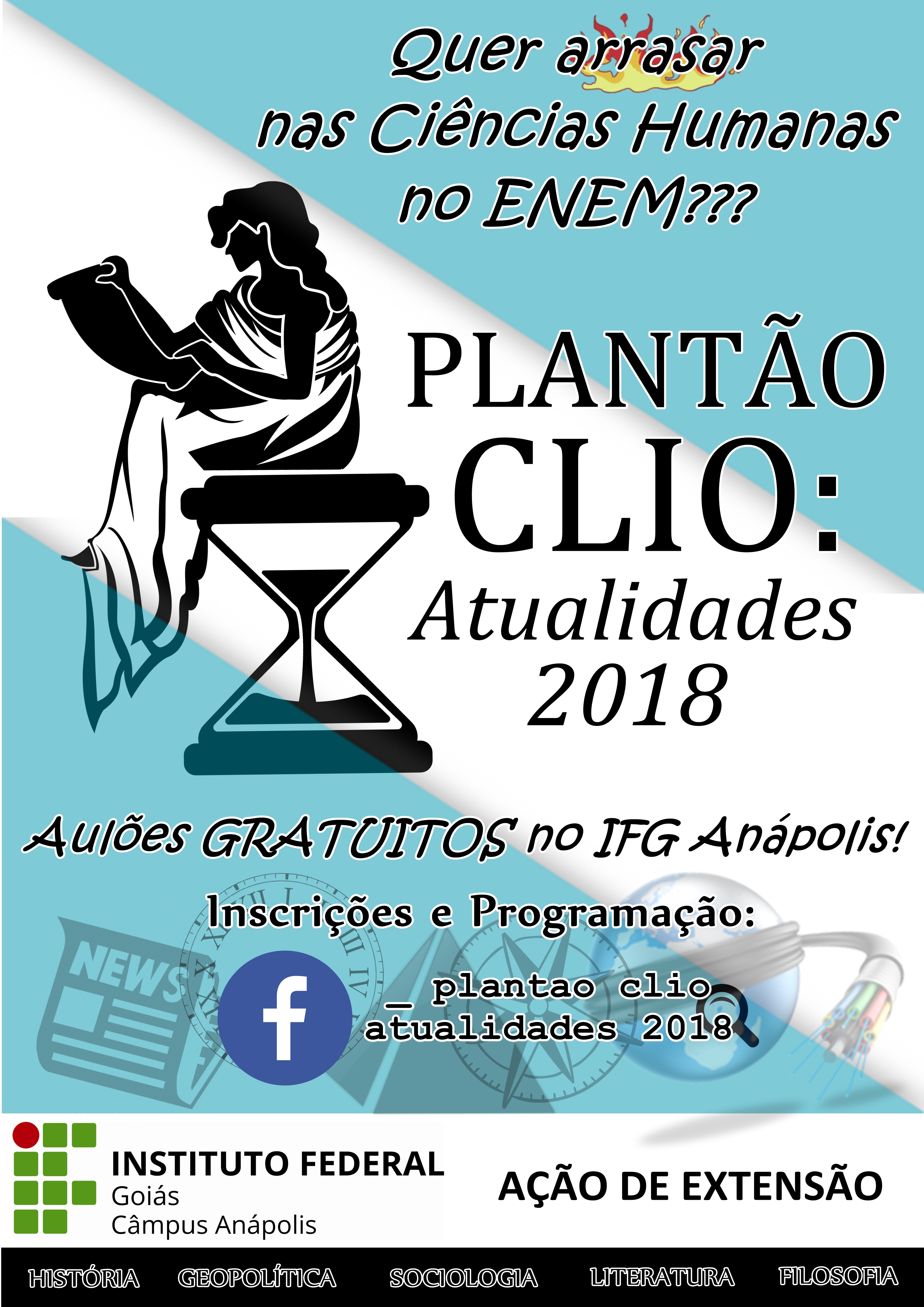 Chamada Pública nº 005/2018 sobre a Ação de Extensão Plantão Clio: Atualidades 2018. Essa Ação de Extensão consiste em uma série de encontros/aulões GRATUITOS, para estudantes dos últimos períodos/ano do Ensino Médio, sobre temas relevantes das Ciências Humanas na atualidade e eventos históricos importantes para este ano, visando colaborar com um maior rendimento dos estudantes participantes no Exame Nacional do Ensino Médio (ENEM) e em demais vestibulares e/ou processos seletivos.