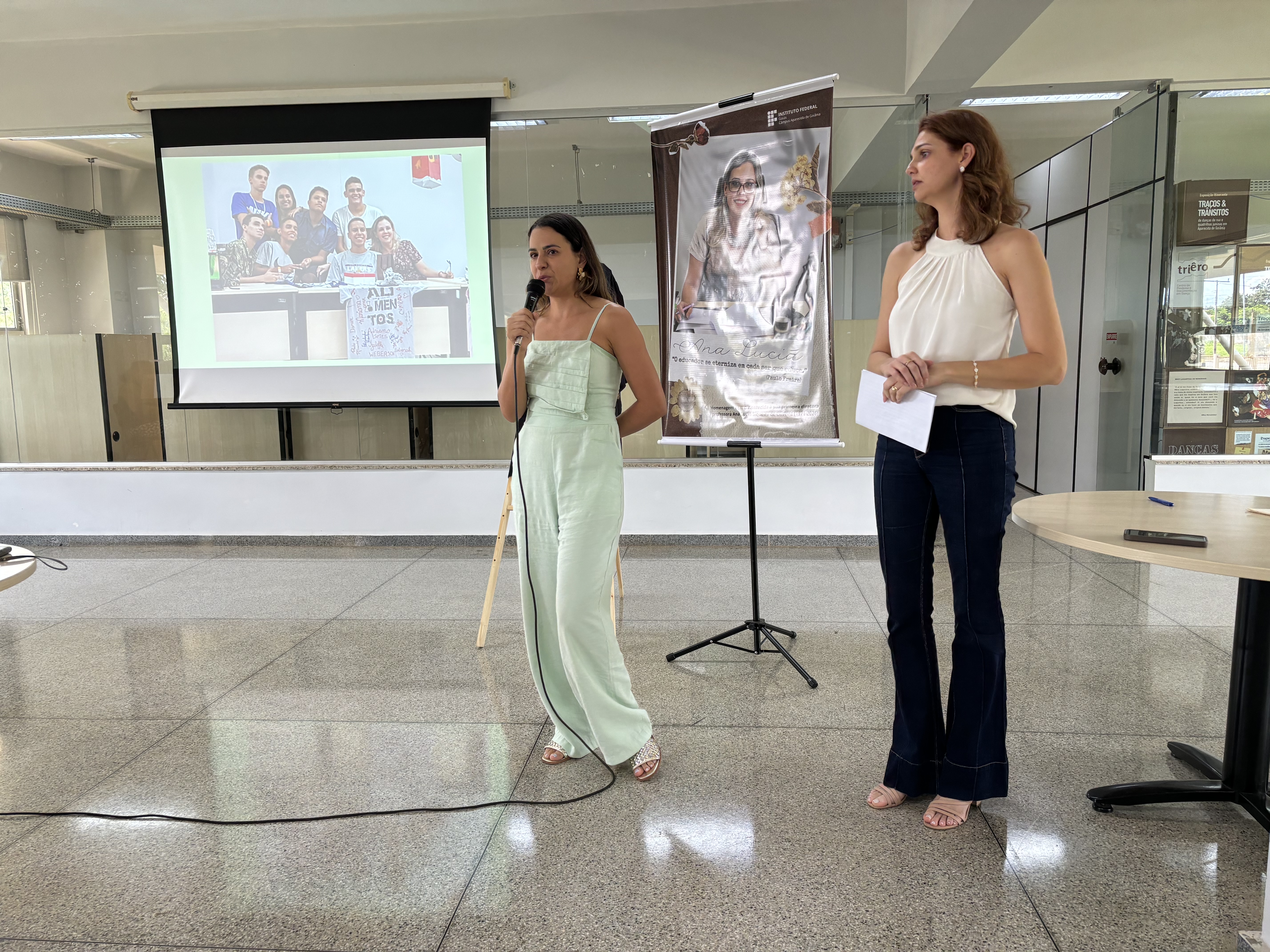 No momento de homenagem em memória da professora Ana Lucia Siqueira de Oliveira, a mestre de cerimônias foi a servidora técnica administrativa Ana Paula da Mota Leite. “Educadora dedicada, artista sensível e gestora comprometida com a educação pública, a professora Ana Lucia teve papel fundamental na implantação e consolidação desta unidade do Instituto Federal de Goiás, contribuindo para a formação de inúmeras trajetórias acadêmicas e humanas”, destacou Ana Paula na abertura do evento informal. Intercalando os pronunciamentos, a programação da cerimônia contou com apresentações musicais do tenor Hudson Ayres (amigo convidado) e do professor Thiago Ruiz, e a declamação de uma poesia pela técnica administrativa Regina Magnabosco.