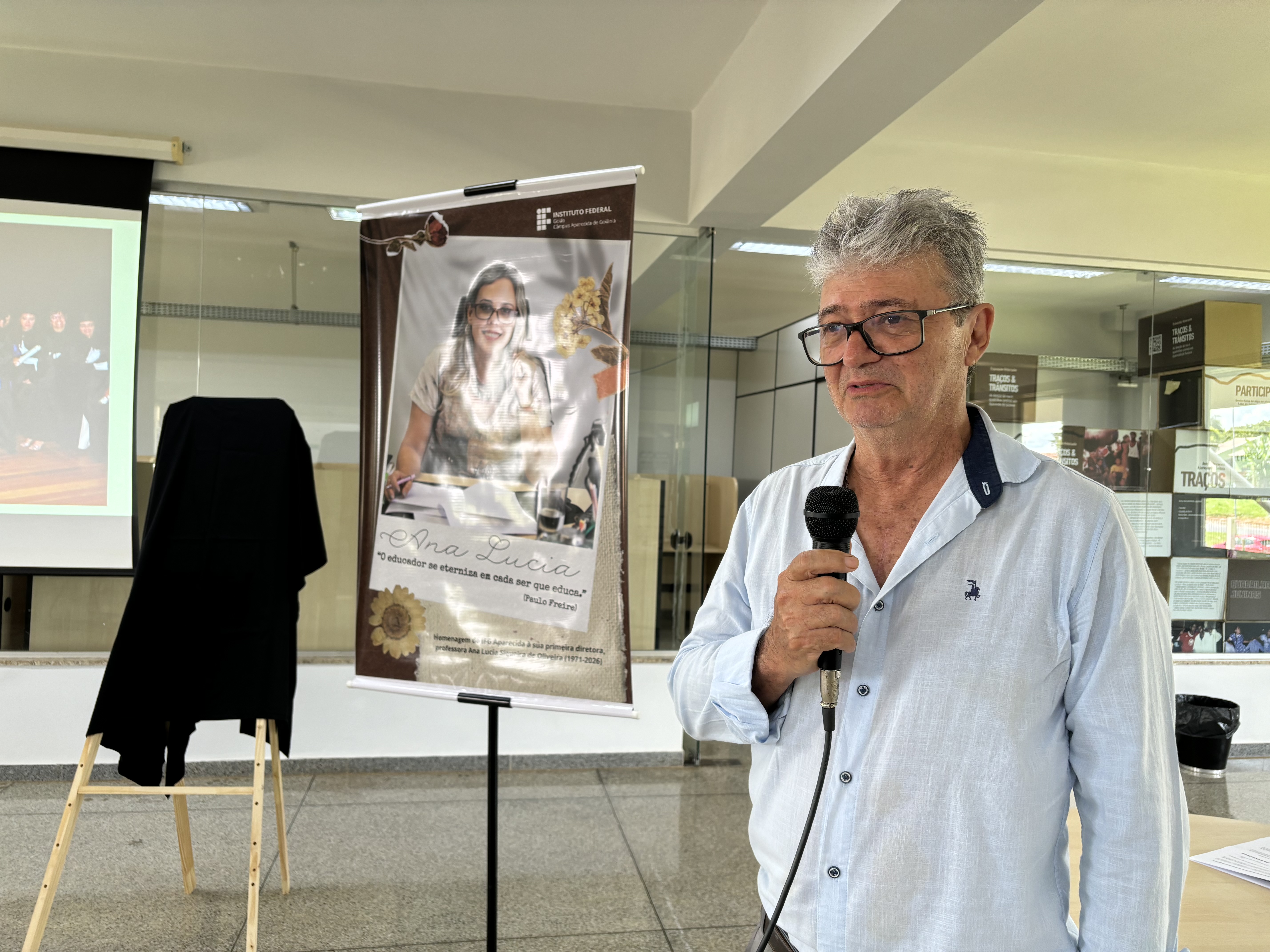 Divino Alvarenga, servidor atualmente aposentado, foi gerente de Administração do Câmpus Aparecida de Goiânia durante todo o período da gestão de Ana Lucia. Ao se pronunciar, ele falou do início dos trabalhos no câmpus e da sensibilidade e responsabilidade da amiga Ana Lucia em tudo o que fazia. “Tratava todos com respeito. O que pudesse ser feito para os alunos, para os servidores e para a Instituição, ela fazia da melhor forma”, afirmou.