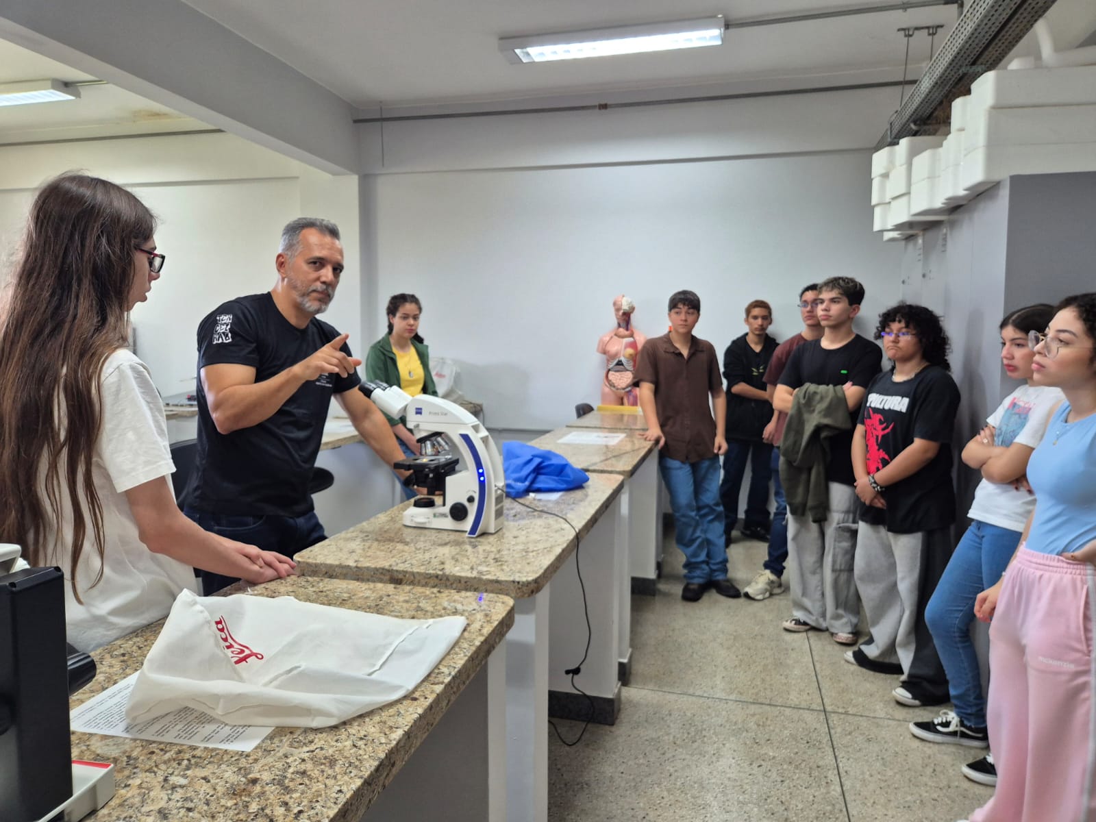 Os ingressantes dos cursos técnicos integrados em tempo integral percorreram o câmpus nos moldes do programa Conhecendo o IFG, em que docentes e técnicos apresentaram os diferentes ambientes, incluindo laboratórios, áreas de convivência e esporte e salas administrativas. Na sala da Direção-Geral do Câmpus, o diretor Marcos Flávio Mércio de Oliveira, reiterou que as portas do gabinete estão sempre abertas para receber os estudantes de todos os cursos em suas demandas no âmbito do IFG Aparecida.