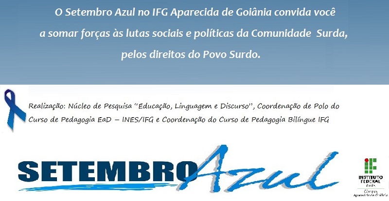 O Câmpus Aparecida de Goiânia do Instituto Federal de Goiás (IFG) iniciou neste sábado, 1° de setembro, uma ampla programação de palestras, discussões e atividades relacionadas ao Setembro Azul, com o objetivo de fortalecer as lutas sociais e políticas da Comunidade Surda. A programação foi organizada pelo Núcleo de Pesquisa “Educação, Linguagem e Discurso”, a Coordenação de Polo do Curso de Pedagogia EaD – INES/IFG e a Coordenação do Curso de Pedagogia Bilíngue do IFG.