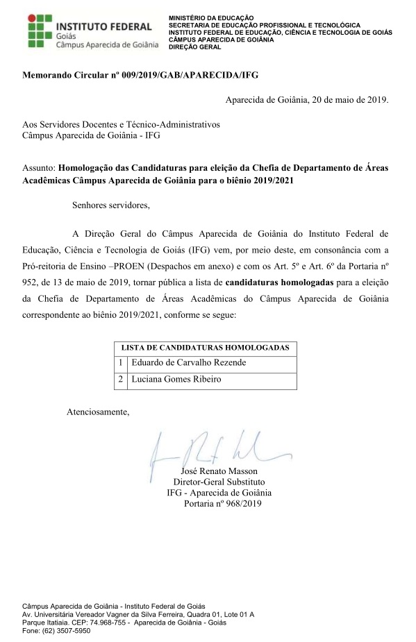 A Direção-Geral do Câmpus Aparecida de Goiânia do Instituto Federal de Goiás divulga a lista de candidatos que poderão concorrer ao cargo de Chefia de Departamento de Áreas Acadêmicas para o Biênio 2019/2021.