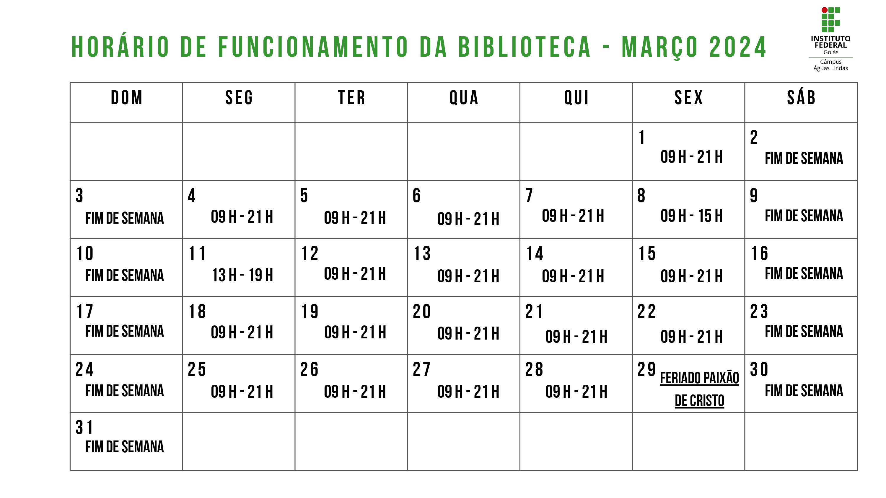 Horário de funcionamento da biblioteca - março