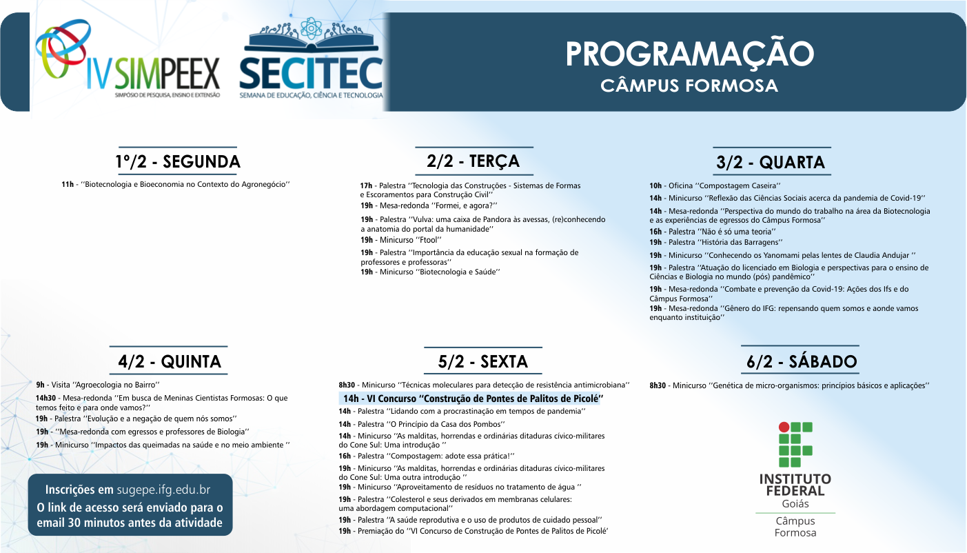 Vários eventos paralelos estarão inseridos na programação da Secitec 2020. A Mostra Integrada de Ensino, Pesquisa e Extensão, o Seminário de Iniciação Científica e o VI Concurso de Construção de Pontes de Palitos de Picolé, que será realizado pelo Câmpus Formosa, na sexta-feira, com início após as 14 horas.