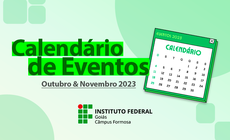 A Gerência de Pesquisa, Pós-Graduação e Extensão (Gepex) divulgou nesta semana o calendário de eventos do Câmpus Formosa e do Instituto Federal de Goiás (IFG) para os próximos meses do corrente ano letivo. A comunidade acadêmica deve se preparar para as atividades, que já estão sendo organizadas pelas comissões.