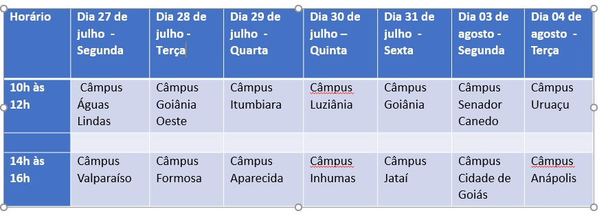 A Reitoria do Instituto Federal de Goiás construiu junto com os 14 câmpus um calendário de reuniões, que serão realizadas a partir do dia 27 de julho. Com o objetivo de estabelecer um diálogo com a comunidade acadêmica e apresentar as ações que estão sendo planejadas e executadas para a retomada do calendário letivo de 2020, esses encontros serão importantes para esclarecer os principais eixos do Plano de Ação. Esses eixos dizem respeito à reelaboração dos calendários; à conectividade; à capacitação; ao Sistema de Ensino Emergencial (SEE); aos equipamentos e protocolos de biossegurança necessários para o momento do retorno das atividades presenciais. As reuniões serão virtuais, e o painel será composto pelo reitor, pelos pró-reitores, pela diretoria executiva e pelos diretores dos câmpus. A reunião com a comunidade acadêmica do Câmpus Goiânia será realizada no dia 31 de julho, das 10h às 12 horas, conforme calendário disponibilizado pela Reitoria.