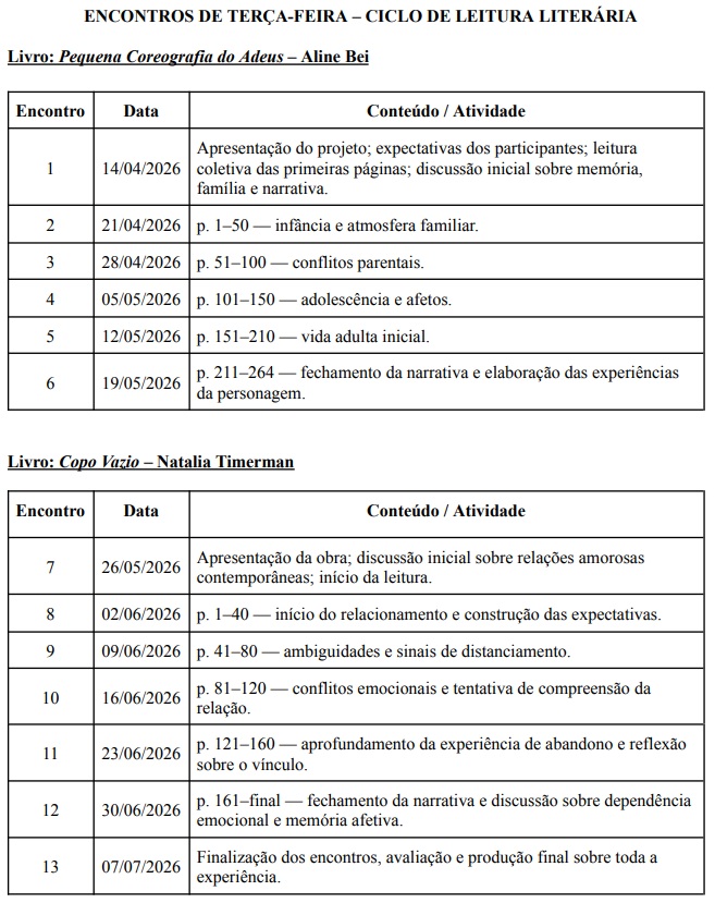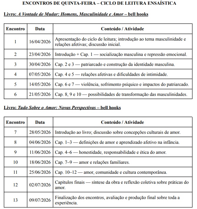 Os encontros serão realizados às terças e às quintas-feiras, das 13h às 15h, na sala T-502 C, com 15 vagas disponíveis para cada grupo. As obras que serão lidas e discutidas às terças são os livros literários "Pequena coreografia do adeus", de Aline Bei, e "Copo Vazio", de Natalia Timerman. Às quintas serão lidos e discutidos os ensaios “Vontade de mudar" e "Tudo sobre o amor", de Bell Hooks. É possível se inscrever para apenas um dos encontros ou para ambos. As atividades terão início no dia 14 de abril.