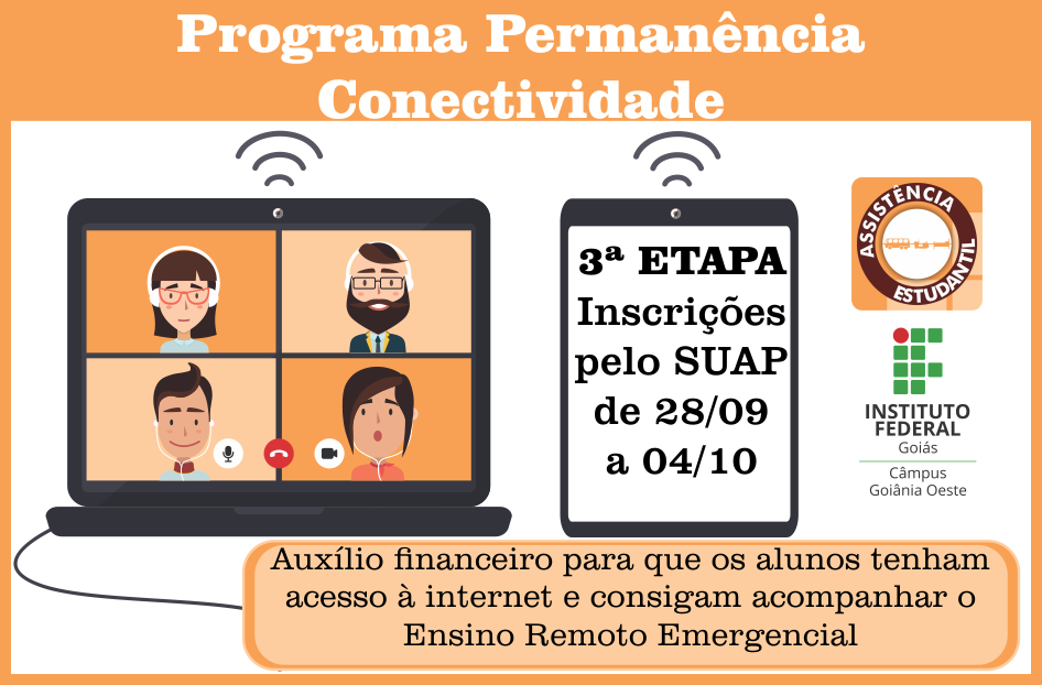 Foram abertas hoje, dia 28, as inscrições da 3ª etapa do Programa Permanência Conectividade – Edital Nº 002/Câmpus Goiânia Oeste/IFG/2020 – destinado a custear condições de acesso à internet, excepcionalmente, durante o Ensino Remoto Emergencial, em decorrência da situação de pandemia da COVID-19. Os estudantes em situação de vulnerabilidade social que não dispõem ou que não têm acesso suficiente à internet terão até o dia 04 de outubro para se inscreverem no Sistema Unificado de Administração Pública (SUAP) – https://suap.ifg.edu.br – para concorrer ao auxílio financeiro de R$ 100 reais mensais, que serão pagos durante a vigência do programa (dezembro de 2020).