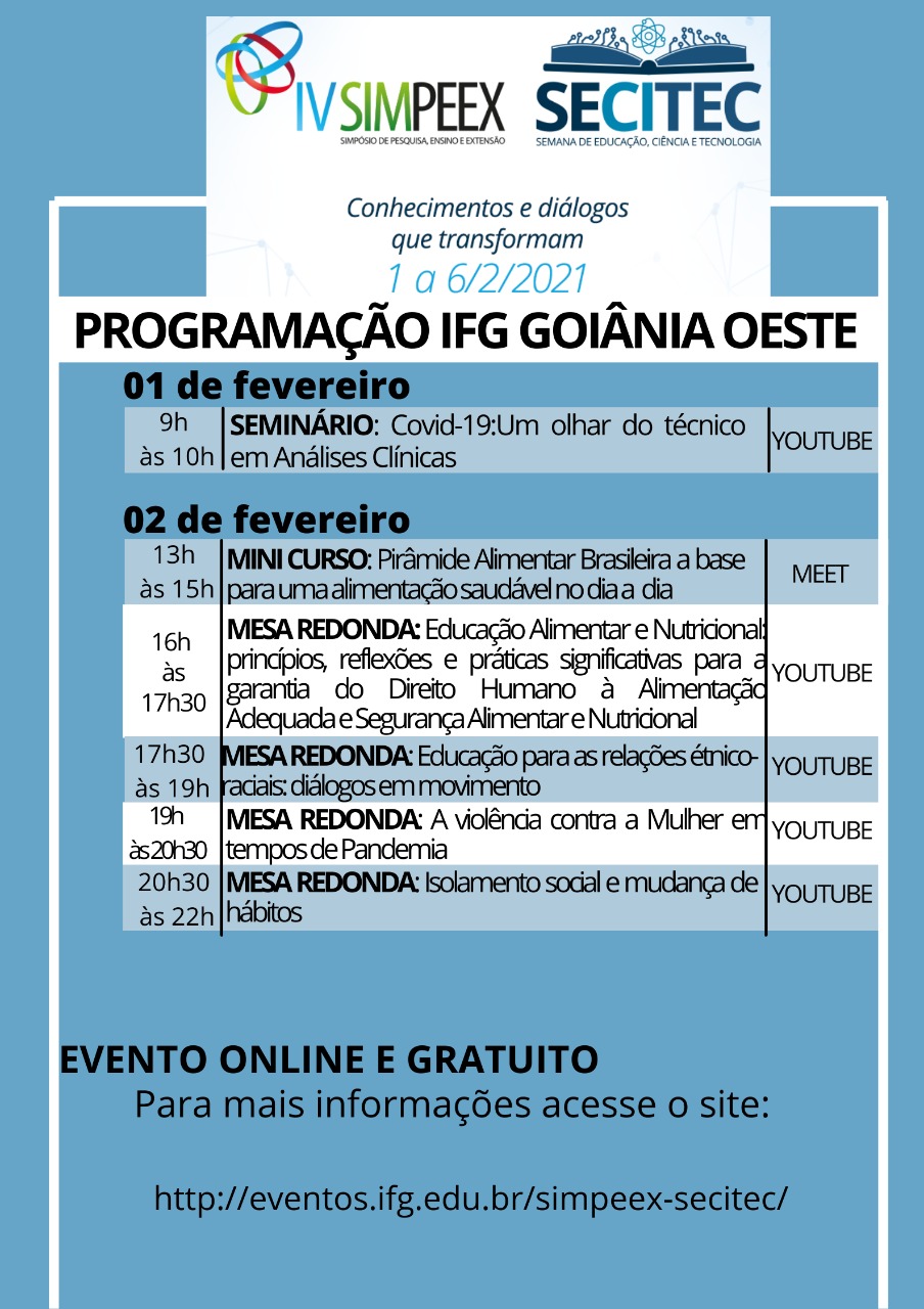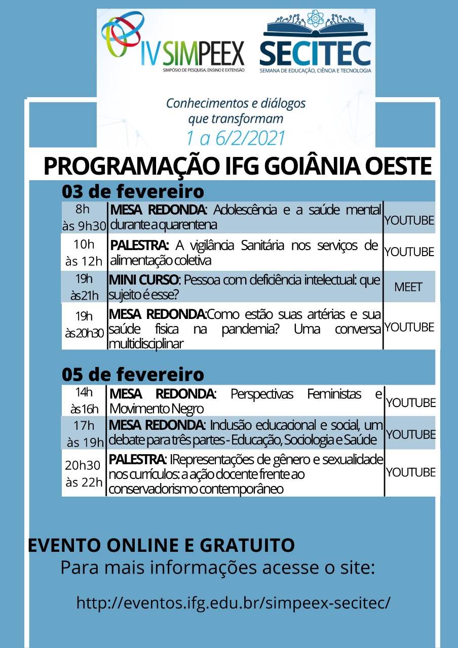 O Instituto Federal de Goiás (IFG) promoverá a partir da próxima segunda-feira, dia 1º de fevereiro, o IV Simpósio de Ensino, Pesquisa e Extensão (Simpeex) em conjunto com as Semanas de Educação Ciência e Tecnologia (Secitecs), realizadas de forma descentralizada nos câmpus. Os eventos serão realizados virtualmente de 1º a 6 de fevereiro. O Câmpus Goiânia Oeste está inserido na iniciativa com a realização de atividades próprias (Confira aqui a programação das atividades do câmpus).