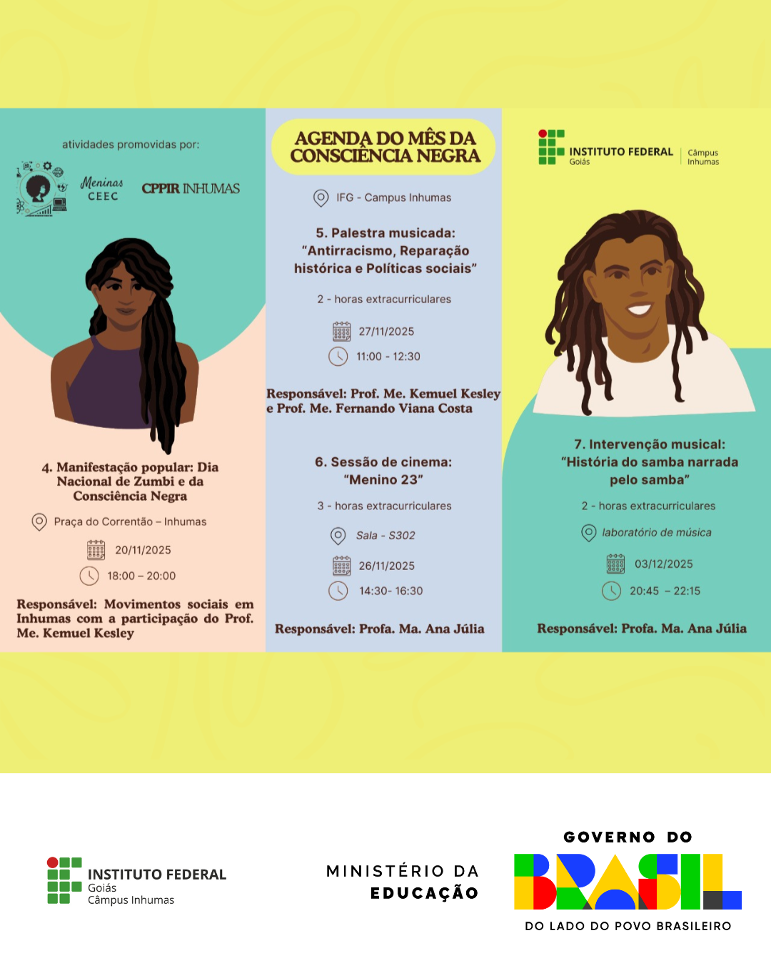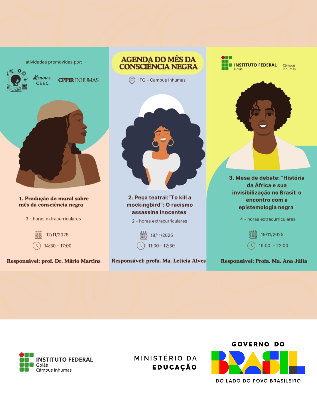 A Comissão de Políticas de Promoção da Igualdade Étnico-Racial (CPPIR) do IFG-Câmpus Inhumas, em parceria com o Projeto Meninas CEEC (de incentivo às meninas nas carreiras de Ciências Exatas, Engenharias e Computação), está promovendo diferentes atividades voltadas para o mês da Consciência Negra. As ações seguem até a primeira semana de dezembro e os estudantes que participarem receberão certificação.