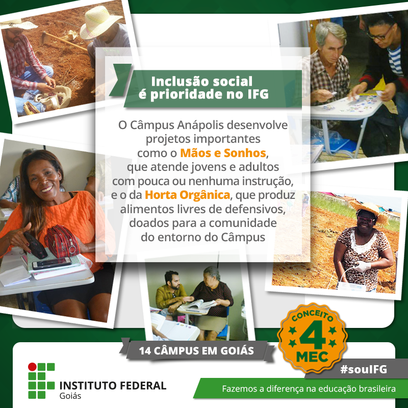 IFG: desenvolvimento regional e a inclusão social. Importantes projetos de extensão são realizados pelo Câmpus Anápolis e beneficiam dezenas de pessoas da comunidade, além de contarem com o apoio de voluntários. Confira na imagem informações sobre alguns dos projetos que ajudam o IFG a fazer a diferença na educação brasileira.