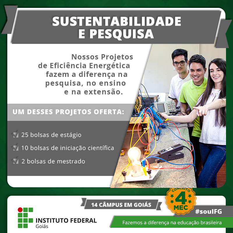 Em breve, o IFG terá redução de mais de 80% no custo anual de energia elétrica, por meio de uma ação de pesquisa. As ações de pesquisa proporcionam um processo educativo, visando a inovação e a solução de problemas científicos e tecnológicos, contemplando o desenvolvimento social, o bem-estar humano e a preservação da natureza. Nesse sentido, há projetos que aliam pesquisa e sustentabilidade, como por exemplo os projetos de Eficiência Energética.