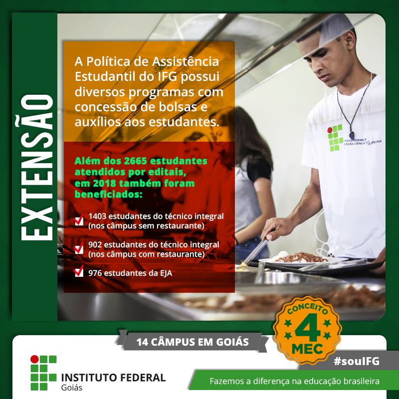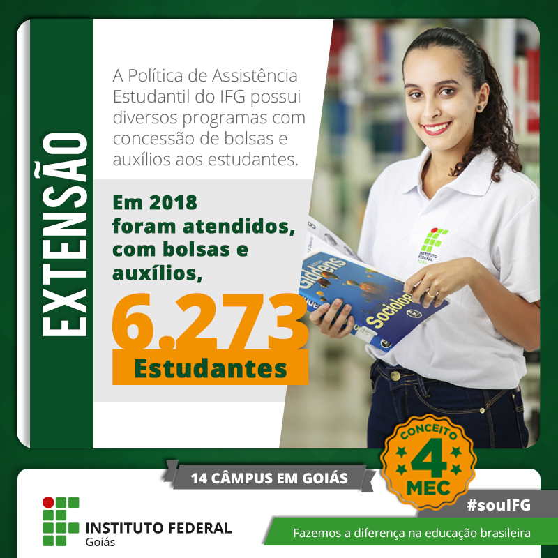 Nos programas de assistência estudantil que o IFG oferece, por meio da Pró-Reitoria de Extensão, são concedidas bolsas que visam o acesso, a permanência e o êxito dos estudantes. Além das bolsas por edital, centenas de outras bolsas e auxílios são concedidos e em breve mostraremos para vocês! Além disso, a extensão mantém um diálogo permanente com a sociedade. #souIFG