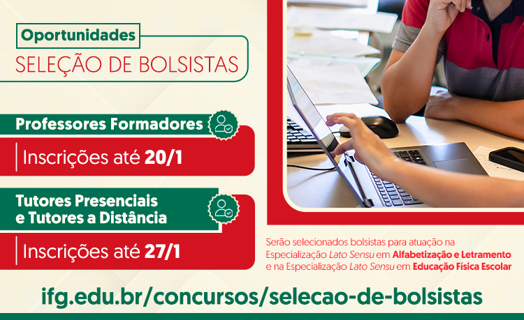 O Instituto Federal de Goiás está com inscrições abertas para seleções de bolsistas que irão atuar em dois novos cursos de especialização da instituição. Há vagas para professores formadores e tutores presenciais e a distância. No caso dos tutores presenciais, há vagas em várias cidades de Goiás. Os selecionados irão atuar nos cursos de especialização lato sensu em Alfabetização e Letramento e em Educação Física Escolar, ambos na modalidade de educação a distância. Os cursos serão ofertados em parceria com a Universidade Aberta do Brasil (UAB).
