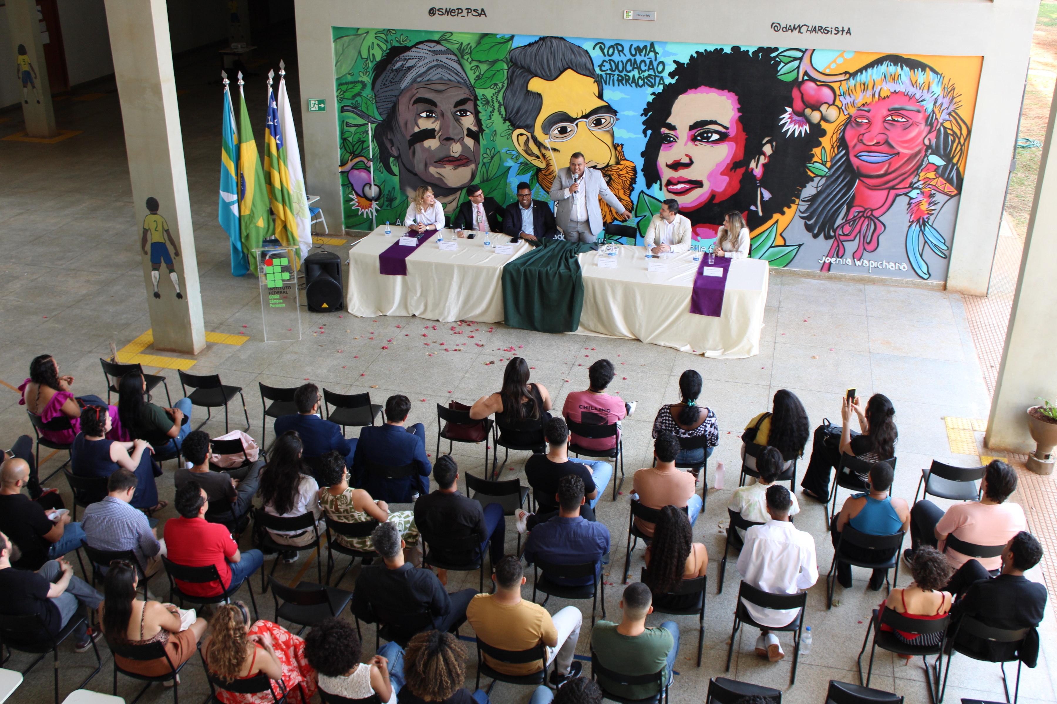 Participaram da mesa diretiva juntamente com a coordenadora-geral do projeto, professora Uyara Ferreira Silva, e com o gerente de Pesquisa, Pós-Graduação e Extensão (Gepex) do Câmpus Formosa, professor Bruno Quirino Leal, o secretário nacional de juventude, Ronald Luiz dos Santos; o diretor de políticas públicas transversais de juventude, Nilson Florentino Júnior; o coordenador-geral de desenvolvimento de sistemas da Diretoria de Tecnologia da Casa Civil da Presidência da República, Waldeyr Mendes Cordeiro; e a diretora de inovação e negócios da FUNTEC, Cíntia Amorim Maganha.