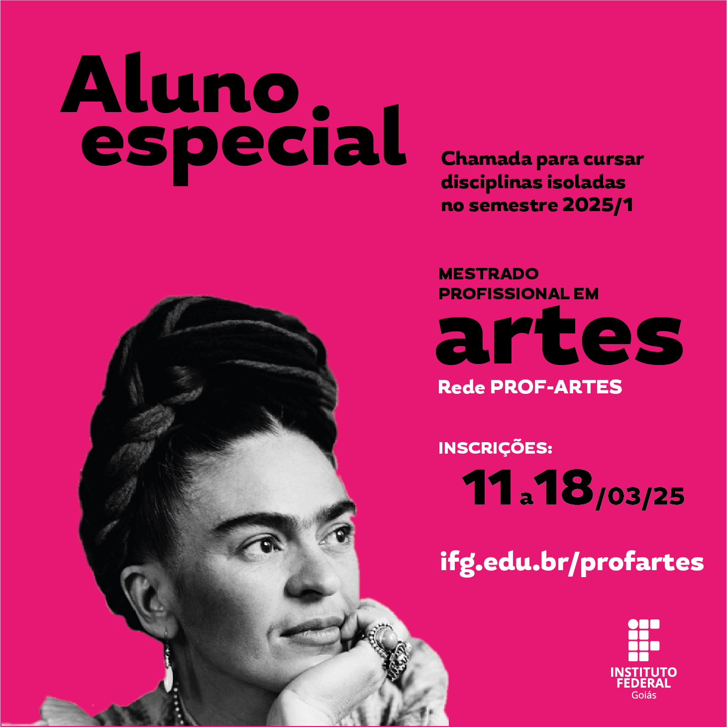 Estão abertas até terça-feira, 18 de março, as inscrições para aluno especial do Mestrado Profissional em Artes / Rede PROFARTES do Instituto Federal de Goiás (IFG), para o semestre 2025/1. Os interessados devem enviar, à Coordenação do Mestrado, carta de intenção para cursar disciplinas isoladas. Estão sendo ofertadas onze vagas em duas disciplinas: “Arte, Cultura e Educação” (5 vagas) e História do Ensino de Arte no Brasil: do Modernismo à Contemporaneidade” (6 vagas). Informações como horário e local das aulas e professores responsáveis podem ser consultadas no Comunicado “Vagas para Alunos Especiais no Semestre 2025/1”.
