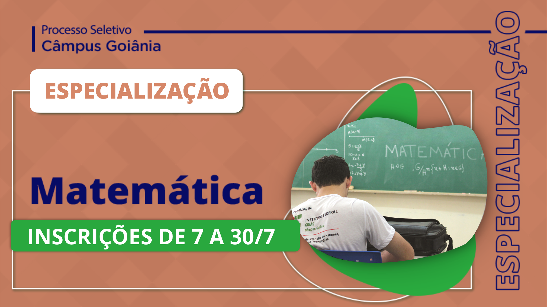 O Câmpus Goiânia recebe, a partir da próxima segunda-feira, 7 de julho, inscrições para a especialização em Matemática. São ofertadas 30 vagas, sendo 20% destinadas, preferencialmente, aos servidores do Instituto Federal de Goiás (IFG). Os interessados podem se inscrever gratuitamente até dia 30 de julho, na página Estude no IFG, clicando em Pós-Graduação e em Seleções em andamento. Podem participar da seleção os portadores de diplomas nas grandes áreas de Ciências Exatas e da Terra e de Engenharias. O curso é gratuito e as aulas são ministradas no período vespertino.