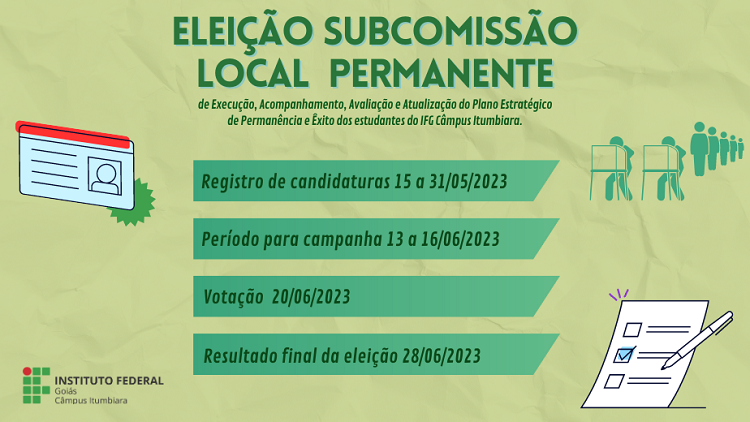 Está aberto o período referente ao registro de candidatura para escolha dos novos representantes da Subcomissão Local Permanente de Execução, Acompanhamento, Avaliação e Atualização do Plano Estratégico de Permanência e Êxito dos Estudantes do Câmpus Itumbiara. O documento que norteia a eleição é a Resolução CONSUP/IFG nº 10, de 19 de março de 2018. Os interessados em registrar a candidatura deverão enviar e-mail para gabinete.itumbiara@ifg.edu.br até o dia 31/05/2023. A eleição acontecerá em 06 de junho.