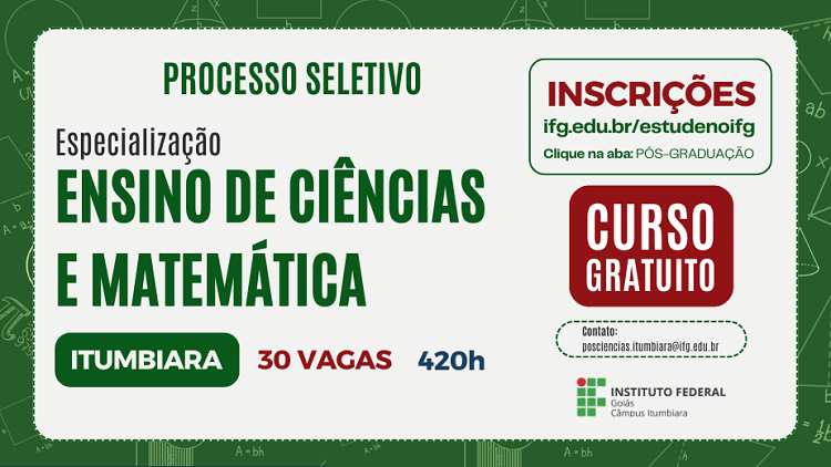 A Reitoria do Instituto Federal de Educação, Ciência e Tecnologia de Goiás (IFG), por meio da Pró-Reitoria de Pesquisa e Pós-Graduação (PROPPG) e da Diretoria de Pós-Graduação (DPG), torna público o edital de seleção para a especialização lato sensu em Ensino de Ciências e Matemática, do Câmpus Itumbiara. São 30 vagas ao todo e o curso terá carga horária de 420 horas. A inscrição é totalmente gratuita e deverá ser feita neste link: http://www.ifg.edu.br/estude-no-ifg/selecoes-em-andamento/pos-graduacao . O período de inscrição será de 22 de fevereiro a 21 de março. As aulas da especialização ocorrerão no período noturno, às terças, quartas e quintas-feiras, das 19h às 22h15, no IFG Câmpus Itumbiara.