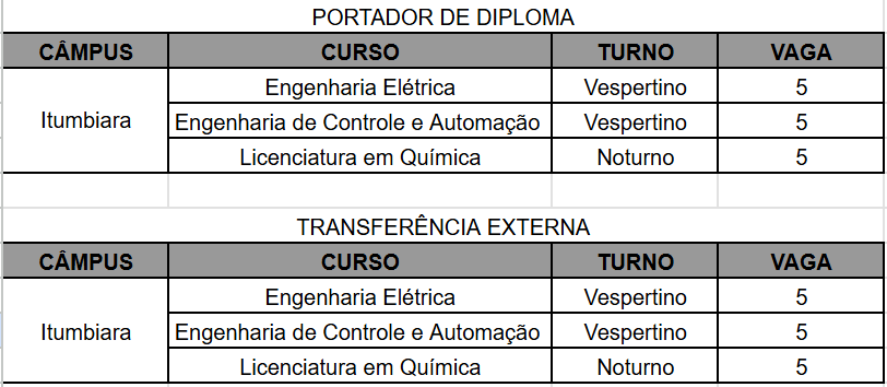 Para os candidatos à transferência externa, a primeira etapa da seleção será a classificação pela nota obtida no Exame Nacional do Ensino Médio (Enem). No ato da inscrição o candidato deve informar o ano do Enem, podendo optar pelos anos de 2013, 2014, 2015, 2016, 2017, 2018, 2019, 2020, 2021, 2022, 2023 e 2024. A segunda etapa consistirá na análise curricular dos documentos exigidos.