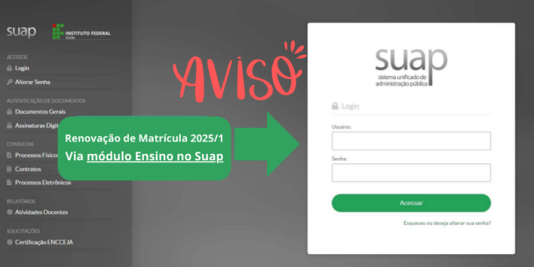 A partir deste primeiro semestre letivo de 2025, a gestão acadêmica dos cursos do IFG Câmpus Itumbiara será realizada somente pelo Sistema Unificado de Administração Pública (Suap). Com isso, os processos de renovação de matrícula e pedido de disciplinas serão feitos no módulo Ensino do Suap, neste link: https://suap.ifg.edu.br/