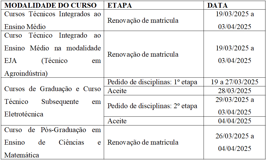 3) Cursos de Graduação e Técnico Subsequente - Renovação de matrícula e escolhas de disciplinas