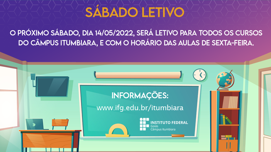 Conforme Calendário Acadêmico 2022 do Câmpus Itumbiara, este próximo sábado, dia 14/05/2022, será sábado letivo com o horário de aulas da SEXTA-FEIRA, para todos os cursos. Considerando os problemas de disponibilidade de espaço físico no Câmpus, os quais são insuficientes para acomodar todas as turmas dos turnos vespertino e noturno no período da tarde do sábado, o sábado letivo será da seguinte forma: