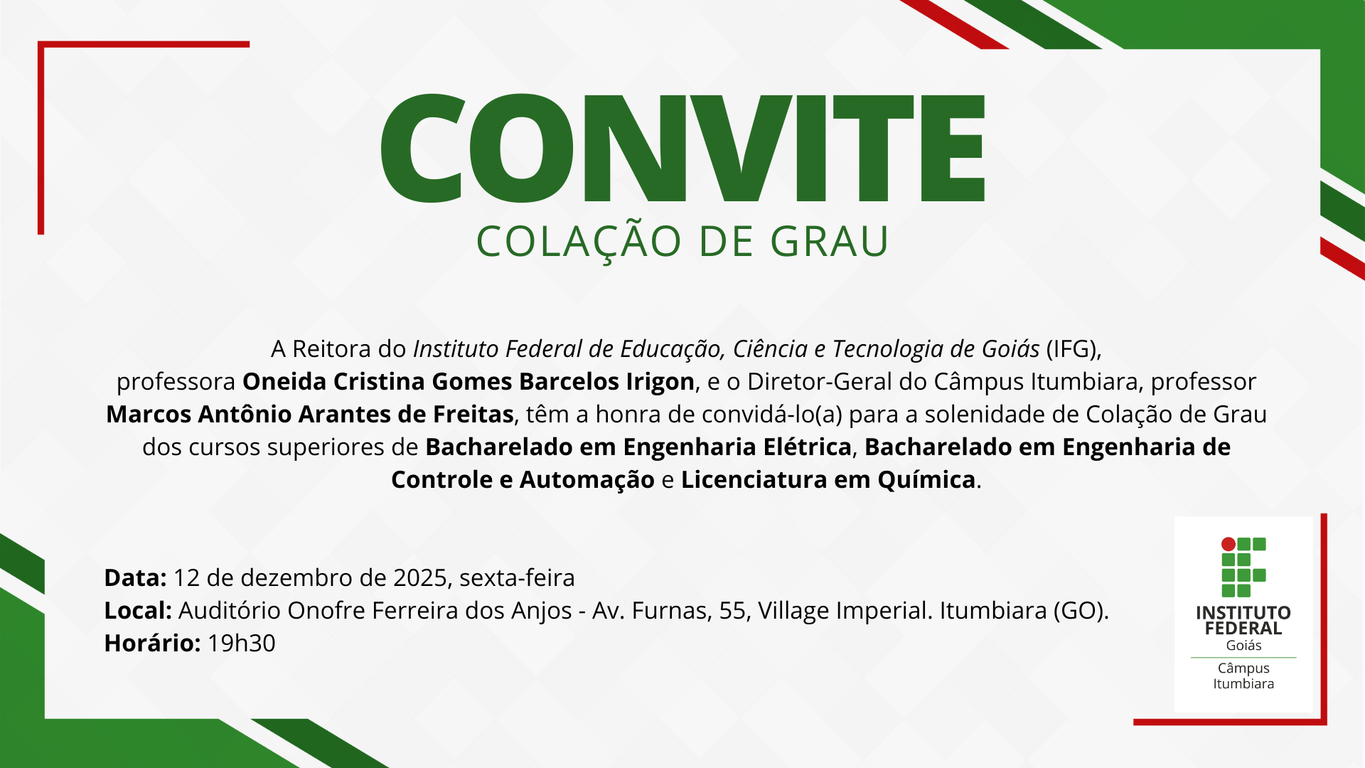A cerimônia está agendada para o dia 12 de dezembro, às 19h30, no auditório do IFG Câmpus Itumbiara.