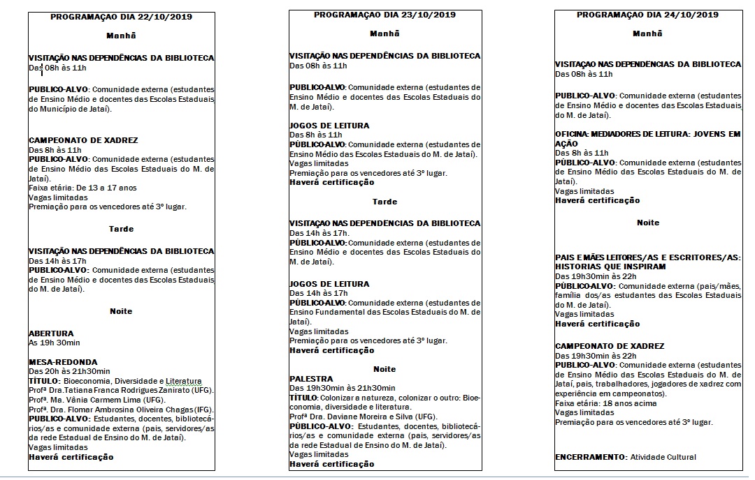 A abertura oficial do evento será realizada na noite do dia 22, a partir das 20h. As professoras Tatiana Franca Rodrigues Zanirato (UFJ), Vania Carmem Lima (UFJ) e Flomar Ambrosina Oliveira Chagas (IFG) irão compor a mesa redonda que dá nome ao Encontro. Já no dia 23, a professora Daviane Moreira e Silva falará sobre “Colonizar a natureza, colonizar o outro: Bioeconomia, diversidade e literatura”.