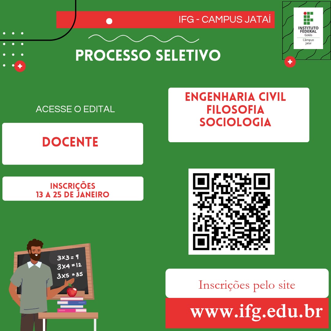 O Câmpus Jataí do O Instituto Federal de Goiás (IFG) publicou o Edital nº 01/2026, com inscrições abertas para Processo Seletivo Simplificado destinado à contratação temporária de professor substituto, para atender a necessidade temporária de excepcional interesse público.