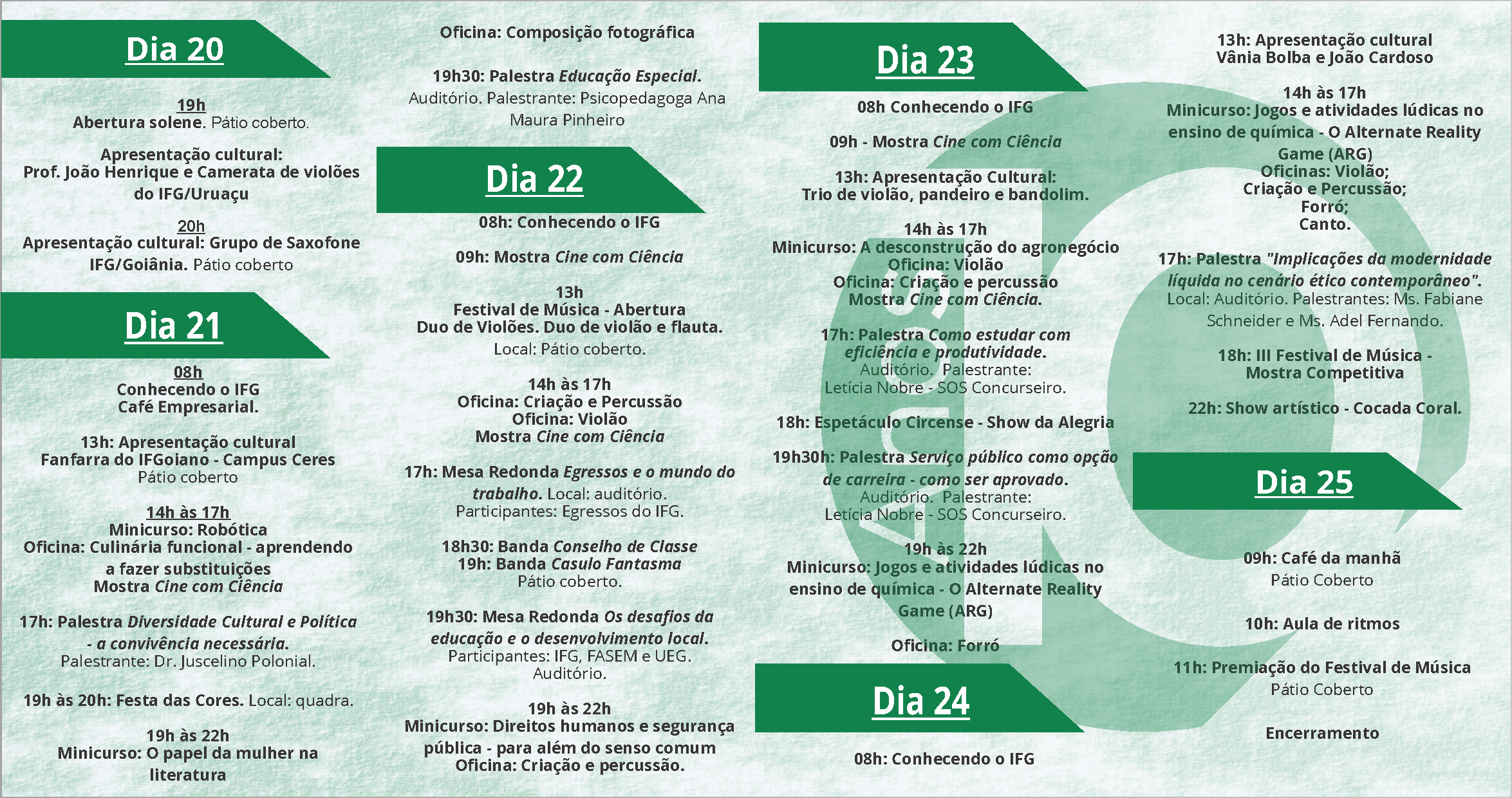 O IFG Câmpus Uruaçu celebra seus 10 anos de participação na comunidade com uma semana de atividades acadêmicas e culturais, todas gratuitas e abertas à comunidade. A programação começa no próximo dia 20 e termina na data de aniversário do câmpus, 25 de agosto.
