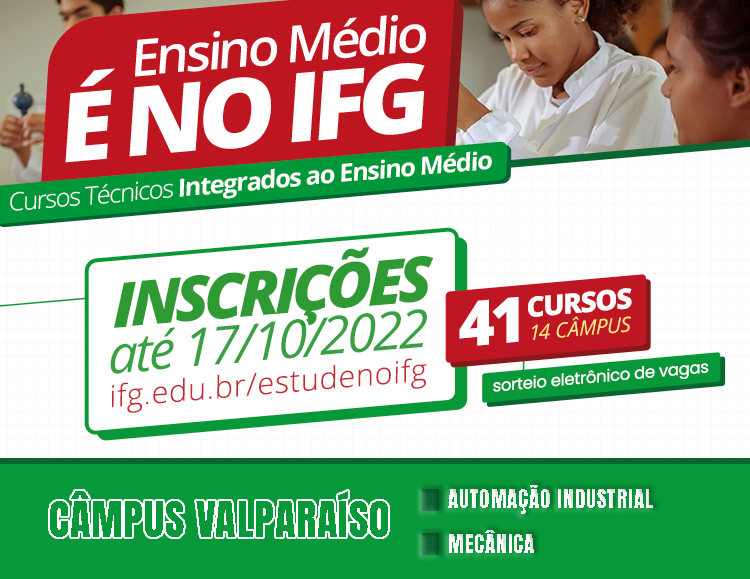 Olá! Você termina o ensino fundamental este ano? Sim, então, temos uma boa notícia! Venha fazer o ensino médio e no mesmo período cursar uma educação profissional! E tudo isto de graça, aqui no Instituto Federal de Goiás (IFG). Participe desta seleção! São diferentes cursos distribuídos pelos nossos 14 Câmpus. Para o Câmpus Valparaíso, são 30 vagas para o curso técnico integrado em Automação Industrial e 30 vagas para o curso técnico integrado em Mecânica (aulas em período integral- manhã e tarde; de segunda a sexta-feira). Inscrições até o dia 17 de outubro, e apenas pela internet, no endereço eletrônico: www.ifg.edu.br/estudenoifg , menu: "TÉCNICO INTEGRADO".