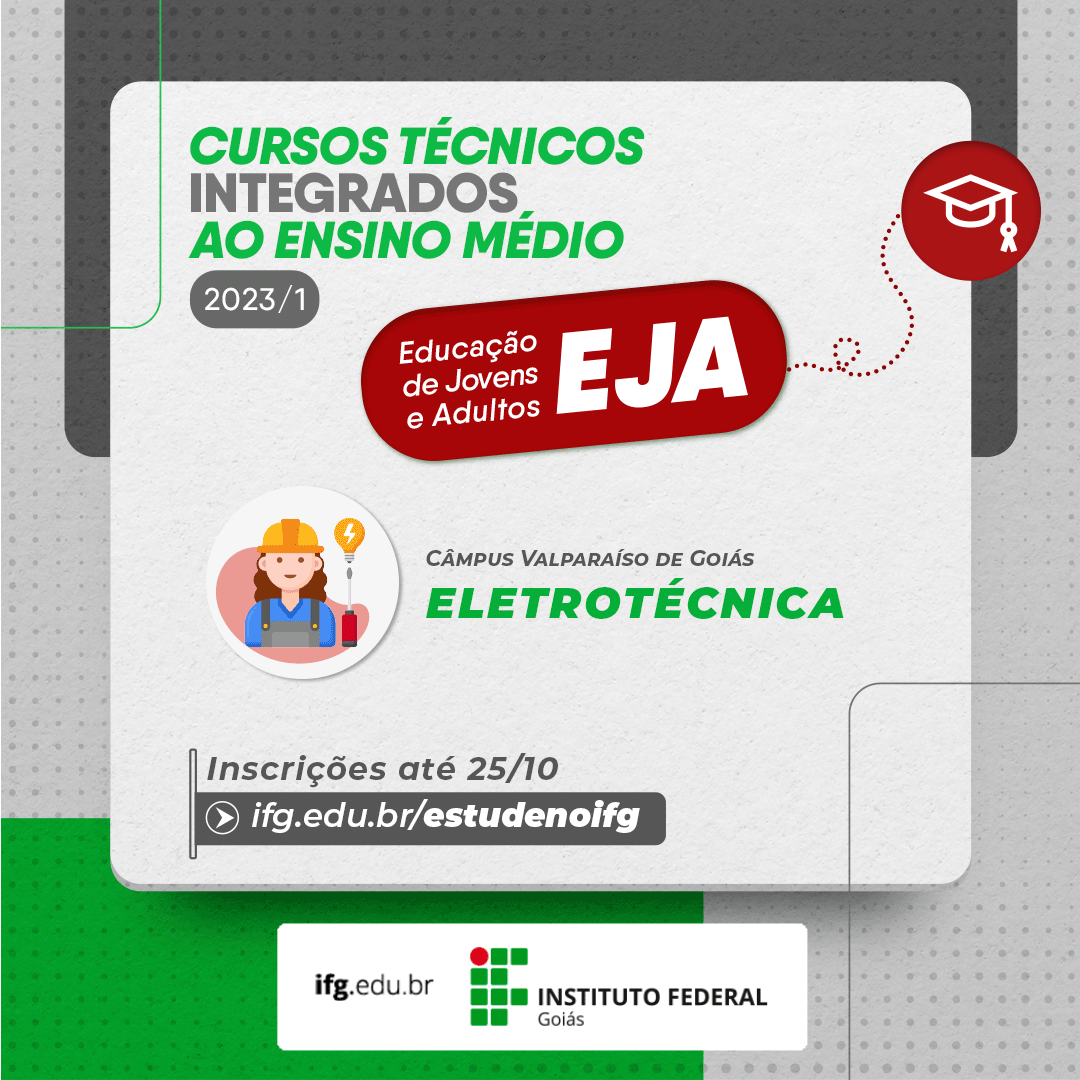 Olá! Você tem 18 anos ou mais? Ainda não tem o ensino médio? Temos uma seleção para você! O Instituto Federal de Goiás (IFG) está com inscrições abertas para a seleção EJA 2023/1. Vagas em diversos cursos por 12 Câmpus da instituição. Para o Câmpus Valparaíso, são 36 vagas para o curso técnico integrado em Eletrotécnica na modalidade de Educação de Jovens e Adultos- EJA. O curso acontece no período noturno. E o que é o curso técnico integrado? Você realiza o ensino médio e um curso profissional conjuntamente. Legal, não é? Inscreva-se até o dia 25 de outubro, pelo site: www.ifg.edu.br/estudenoifg , menu: "EJA-EDUCAÇÃO DE JOVENS E ADULTOS" , depois vai até o link: "SELEÇÃO EJA 2023/1".
