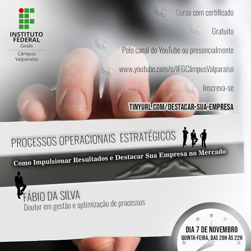 Do pequeno ao grande empreendedor, que tal aprender como melhorar o desempenho da sua empresa? O Instituto Federal de Goiás (IFG) Câmpus Valparaíso irá disponibilizar pelo canal do YouTube ou presencialmente, o curso: Processos Operacionais Estratégicos: Como Impulsionar Resultados e Destacar Sua Empresa no Mercado, no dia 07 de novembro, quinta-feira, das 20h às 22h. Mas para participar, é preciso fazer a inscrição em: tinyurl.com/destacar-sua-empresa . Além do aprendizado e de potencializar o funcionamento do seu empreendimento, ainda vale certificado! E tudo isso de forma gratuita! Venha fazer este curso com a gente!
