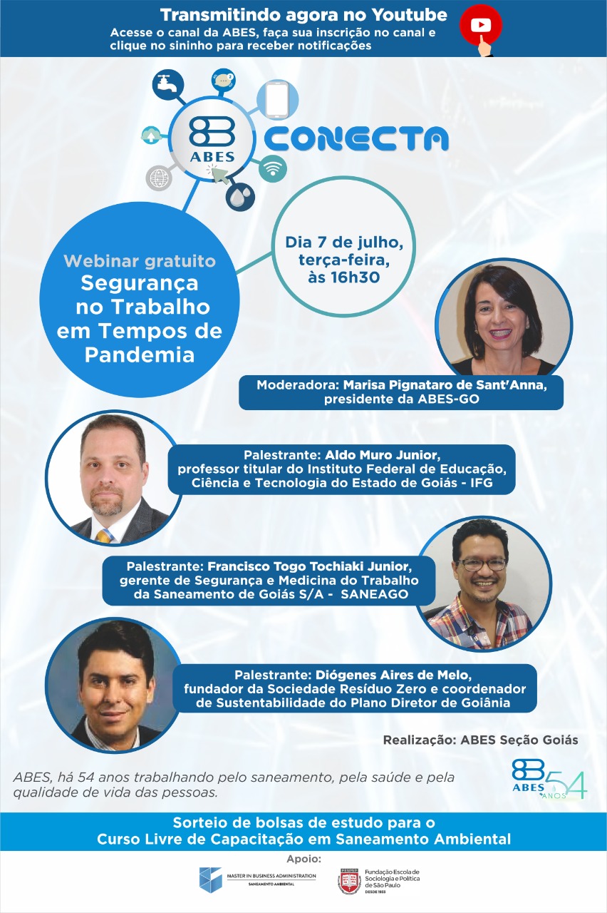 O professor do curso de Engenharia Ambiental e Sanitária do Câmpus Goiânia do Instituto Federal de Goiás (IFG), Aldo Muro, participa do evento ABES Conecta: eventos online. Promovido pela Associação Brasileira de Engenharia Sanitária e Ambiental (Abes), a ação consiste em diversos webinares que são veiculados pelo canal da Abes no Youtube. Aldo participa da ação que será realizada no dia 7 de julho, às 16h30, que tem como tema “Segurança do trabalho em tempos de pandemia”.