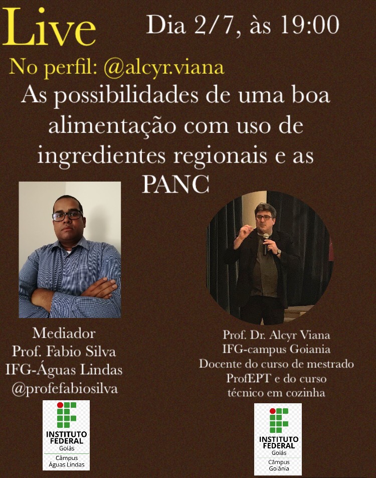 Na primeira live do mês, serão discutidas as possibilidades de uma boa alimentação com uso de ingredientes regionais e as PANC, que são plantas alimentícias não convencionais. Para debater o tema, o professor Alcyr Viana convidou o professor Fabio Silva, que é docente do Câmpus Águas Lindas.