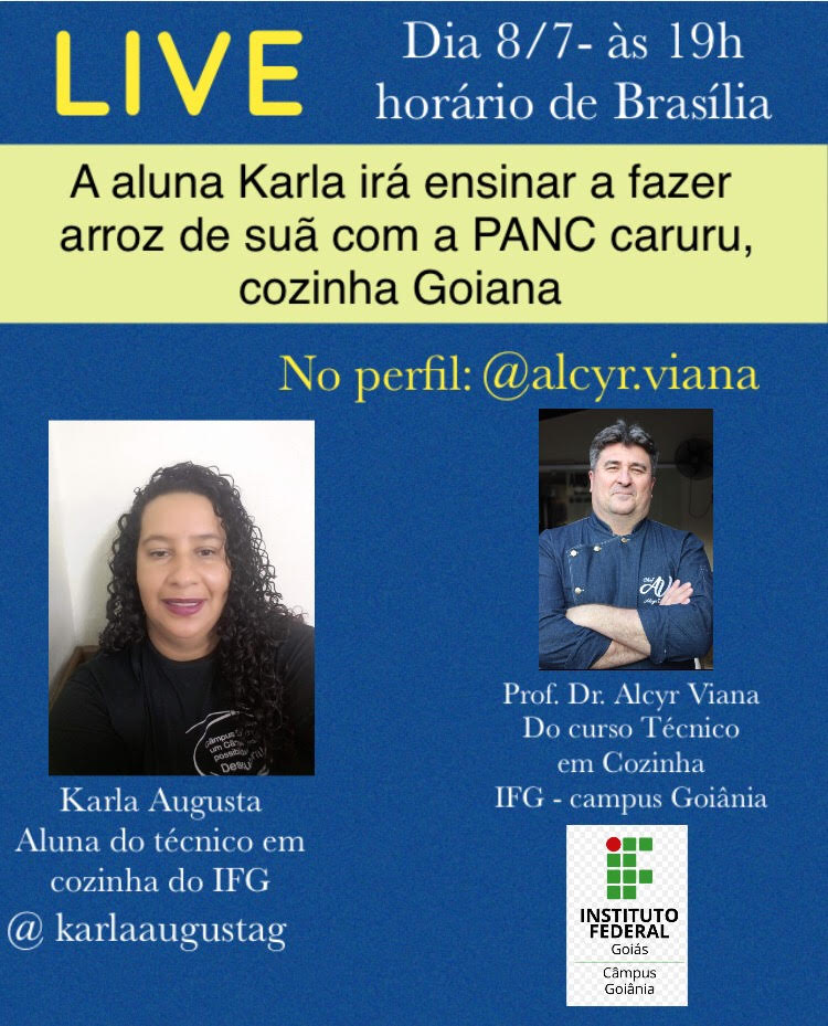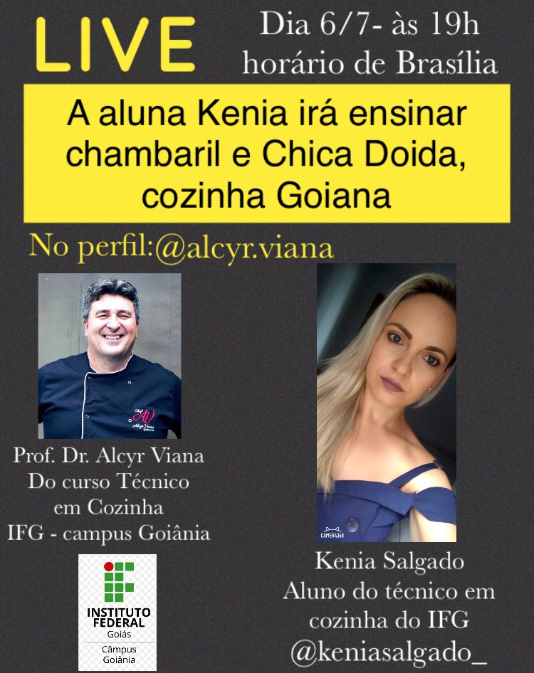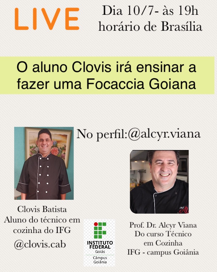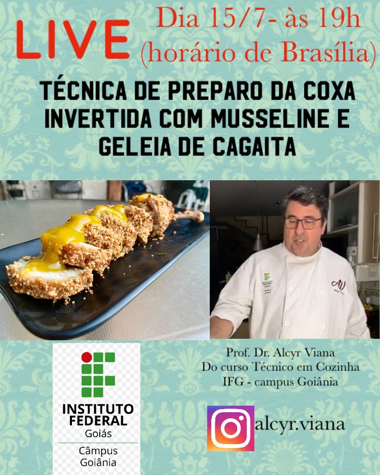 Desde o início da pandemia e, com a suspensão do calendário acadêmico, as lives gastronômicas são oportunidades para quem deseja aprender mais e se aperfeiçoar na culinária. Inicialmente concebidas para levar conteúdos aos estudantes do curso técnico integrado em Cozinha, ofertado modalidade da Educação de Jovens e Adultos, as lives abarcam conhecimentos que também interessam a comunidade externa. As lives são transmitidas no perfil do professor IFG Alcyr Viana (perfil @alcyr.viana no instagram), docente do Câmpus Goiânia do IFG.