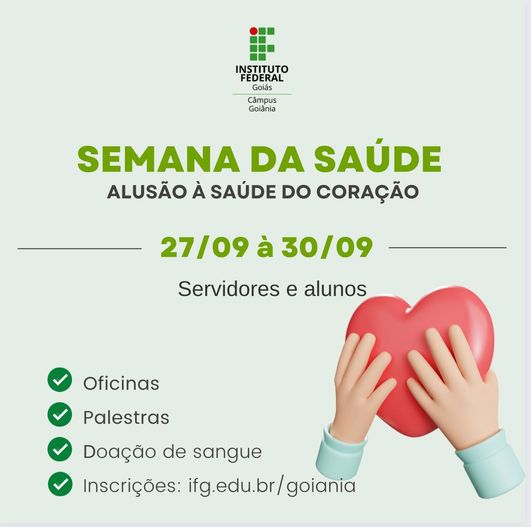 Entre os dias 27 e 30 de setembro do Câmpus Goiânia do Instituto Federal de Goiás (IFG) realiza a Semana da Saúde, com o tema: "A Saúde do Coração". A ação visa promover à saúde cardiovascular e prevenir adoecimentos assintomáticos do coração, que representam a maior causa de morte no Brasil, em 2022, de acordo com estimativa da Organização Mundial da Saúde (OMS). O evento contará com diversas atividades para incentivar a comunidade acadêmica no cuidado com a saúde. As inscrições estão abertas e devem ser realizadas pelo Sistema Unificado de Gestão de Extensão e Pesquisa (Sugep). A inscrição deverá se feita em cada atividade.