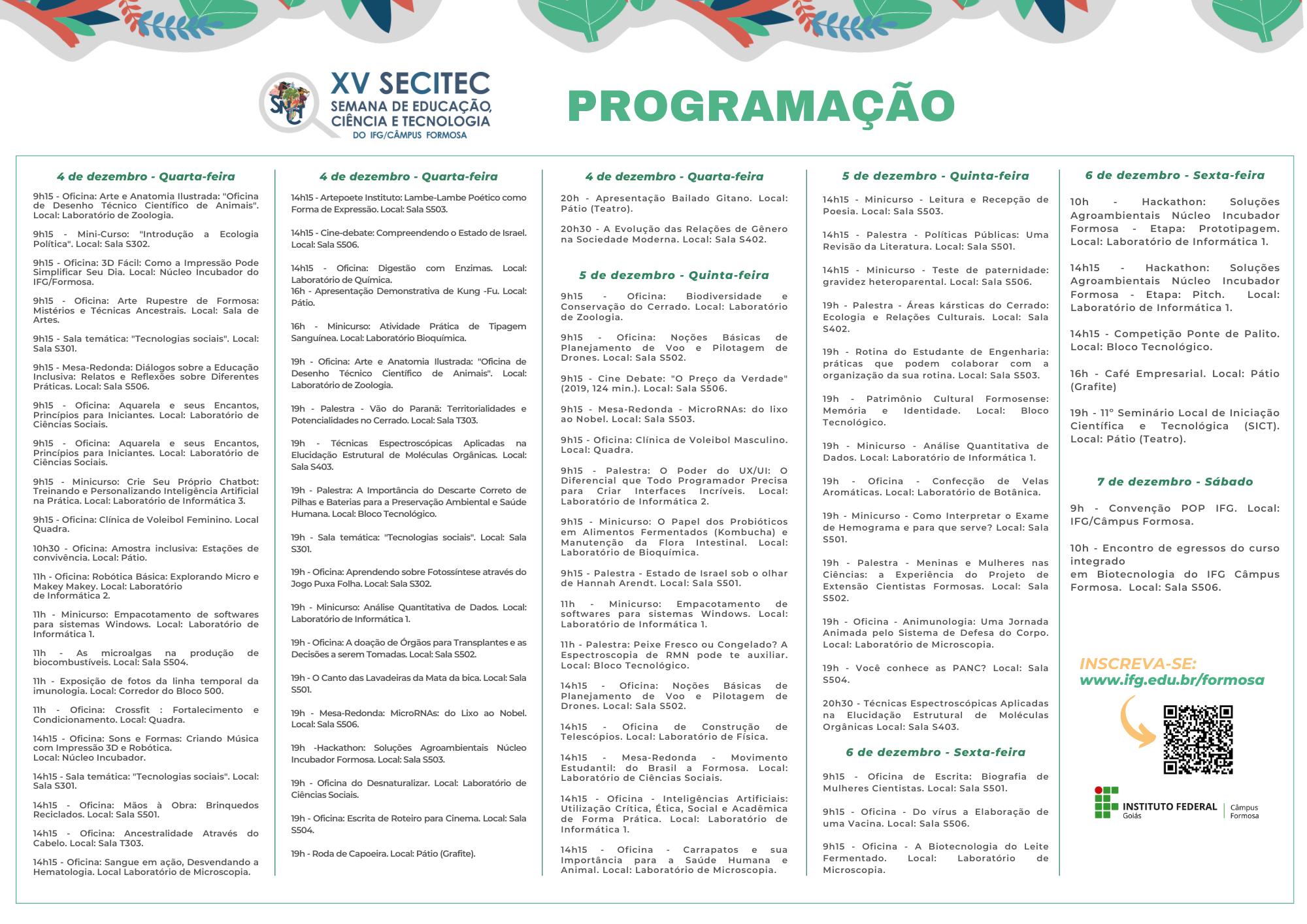 As atividades serão interpretadas por profissionais da equipe do Núcleo de Atendimento às Pessoas com Necessidades Específicas (Napne) do Câmpus Formosa, mediante a participação de surdos. Os primeiros cem inscritos receberão um kit Secitec, composto por pasta, bloco de anotações, caneta, post its e chaveiro.