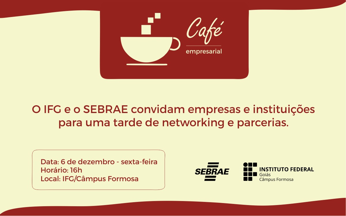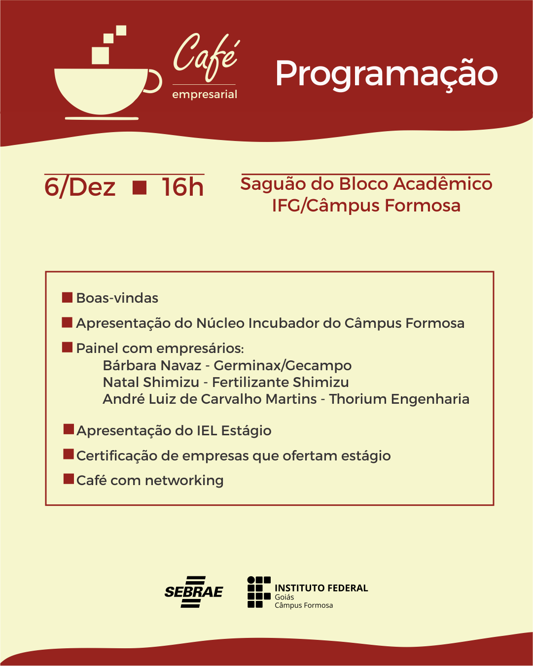 Após uma pausa de cinco anos, as empresas formosenses - comércio e indústria - têm novamente um encontro marcado com o IFG no dia 6 de dezembro, a partir das 16h. O momento é destinado à integração entre instituição e comércio/indústria, com o apoio do Sebrae-GO. Quem desejar participar assistirá à participação do Núcleo Incubador do Câmpus Formosa e suas possibilidades de incubação de projetos, à fala de empresas consolidadas, à explanação do Instituto Euvaldo Lodi (IEL) sobre estágio e à certificação de parceiros ofertantes de estágio. Vem tomar um cafezinho com a gente!