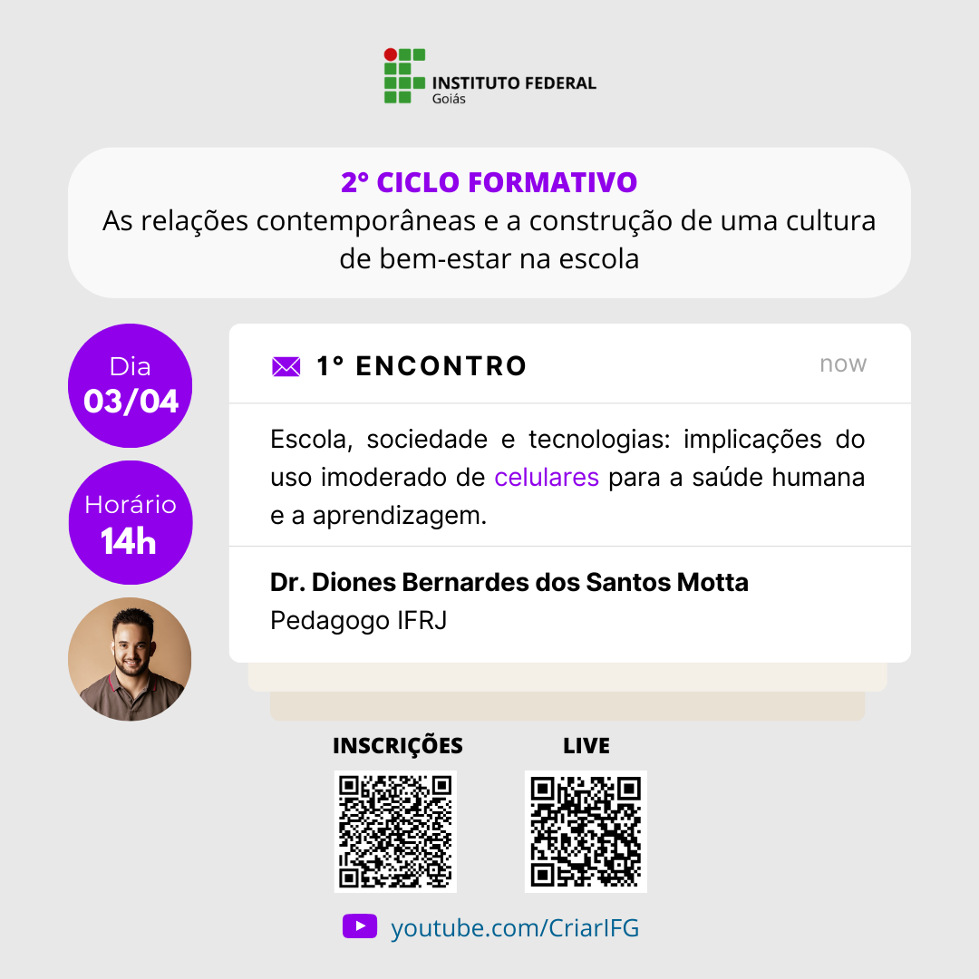 No dia 3 de abril, às 14 horas, acontece o 2° Ciclo Formativo - As relações contemporâneas e a construção de uma cultura de bem-estar na escola. Com o tema "Escola, sociedade e tecnologias: implicações do uso imoderado de celulares para a saúde humana e a aprendizagem", a palestra será ministrada pelo professor Diones Bernardes dos Santos Motta e transmitida on-line por meio do YouTube.