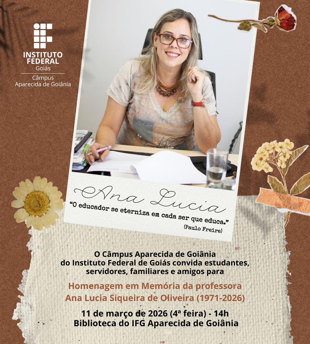 O IFG – Câmpus Aparecida de Goiânia convida estudantes, servidores, familiares e amigos para um momento especial de memória e reconhecimento à trajetória da professora Ana Lucia Siqueira de Oliveira (1971–2026), educadora que marcou profundamente a história do câmpus e a vida de muitas pessoas por meio do ensino, da sensibilidade e do compromisso com a educação.