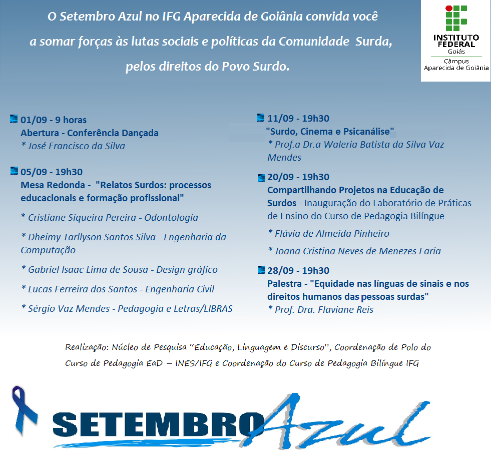 O chamado “Setembro Azul” tem uma programação de eventos durante todo o mês no Câmpus Aparecida de Goiânia do IFG, onde funciona o curso de Licenciatura em Pedagogia Bilíngue Libras-Português, pioneiro no País na modalidade presencial.
