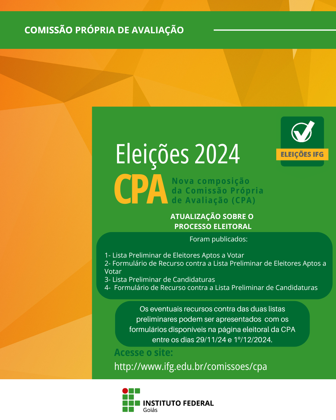 Os eventuais recursos contra das duas listas preliminares podem ser apresentados via formulário próprio disponível na página eleitoral da CPA: https://www.ifg.edu.br/comissoes/cpa?showall=&start=1 entre os dias 29/11/24 e 1º/12/2024.